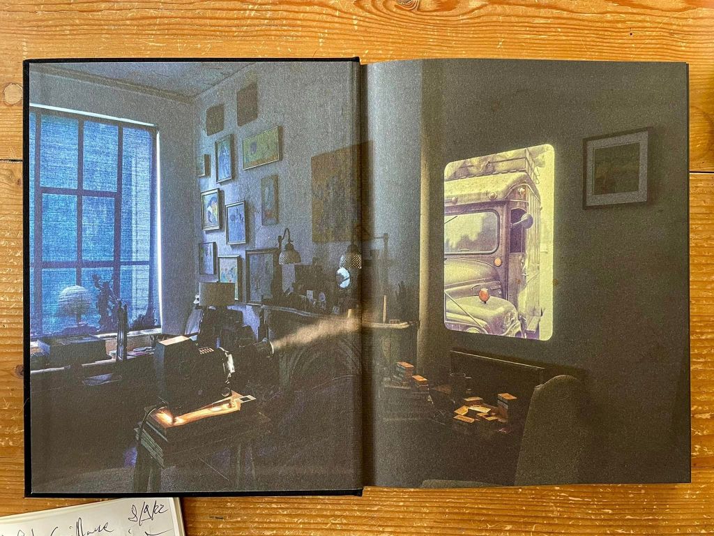 Une pièce tenue dans une demie obscurité, encombrée de livres et de boites de films. Sur un pan de mur, le seul qui ne soit pas constellé de tableaux, et libre des hautes baies vitrées, un vieux projecteur de diapositives étend son cône de lumière et trace, pariétal, le halo de lumière d’un Kodachrome de Saul Leiter.
