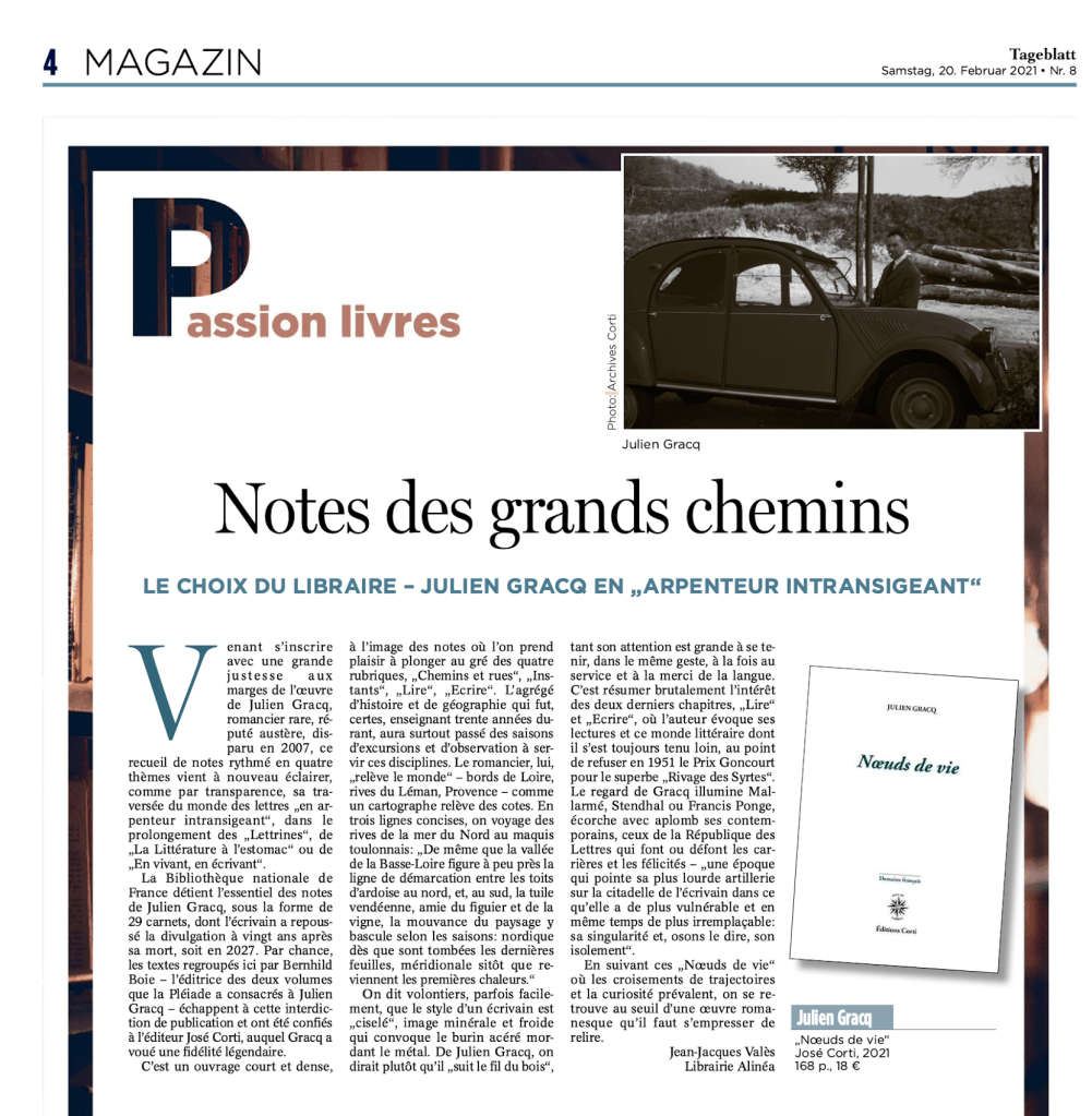 La Bibliothèque nationale de France détient l’essentiel des notes de Julien Gracq, sous la forme de 29 carnets, dont l’écrivain a repoussé la divulgation à vingt ans après sa mort, soit en 2027. Par chance, les textes regroupés ici par Bernhild Boie – l’éditrice des deux volumes que la Pléiade a consacrés à Julien Gracq – échappent à cette interdiction de publication et ont été confiés à l’éditeur José Corti, auquel Gracq a voué une fidélité légendaire.