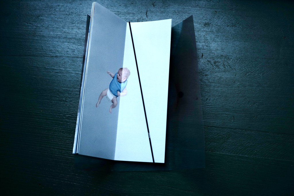 Originalité de forme : l’objet livre, avant d’être parcouru, doit être accouché. En détachant un velcro, qui libère les lèvres de l’étui translucide. Ou bien, le faire surgir, glisser hors de son écrin (placentaire).