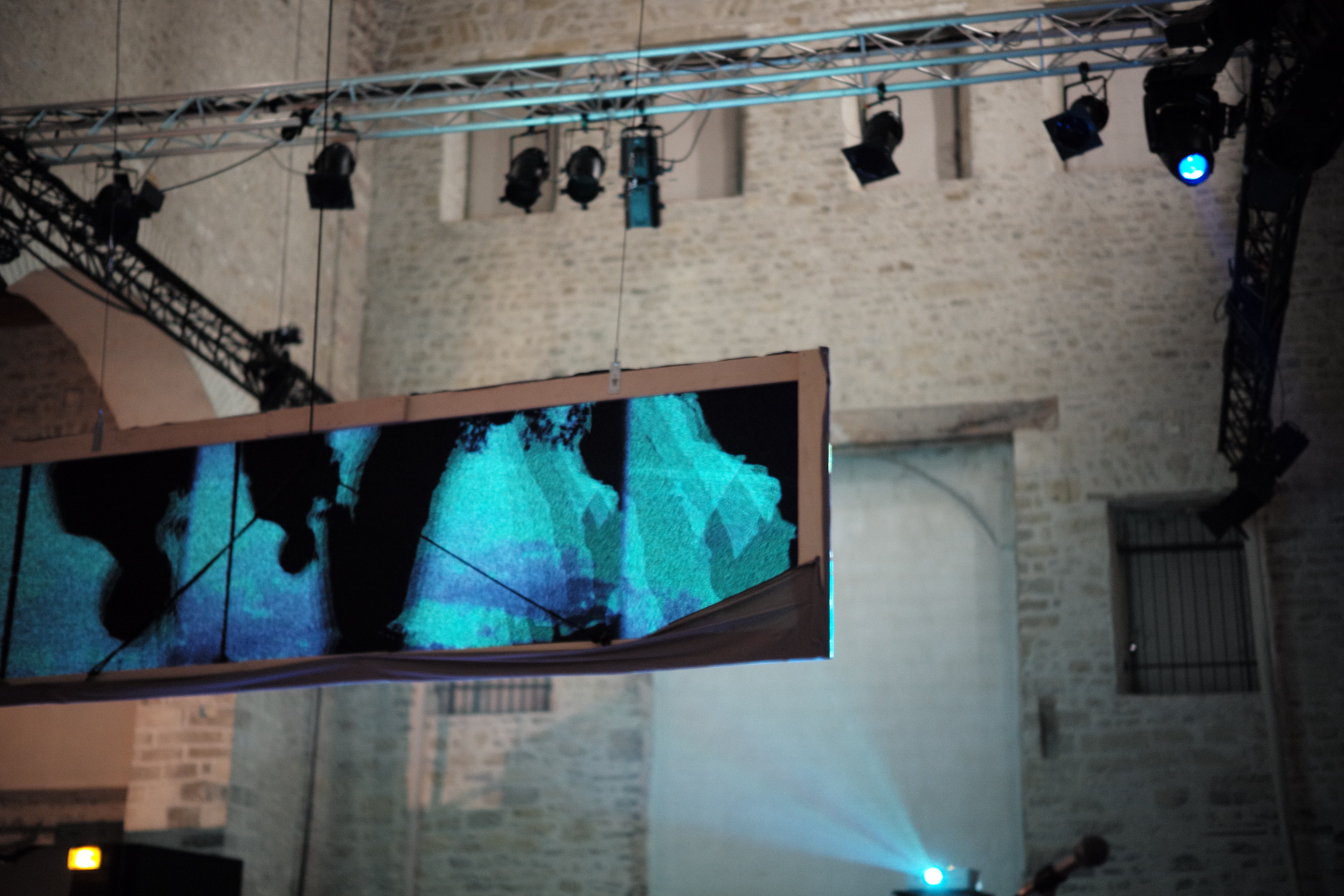 La suite instillera l’idée que le lieu, minéral, rapidement présenté comme une église dé-sacralisée, reste imprégné de l’usage pour lequel ses murailles se sont ancrées ici.