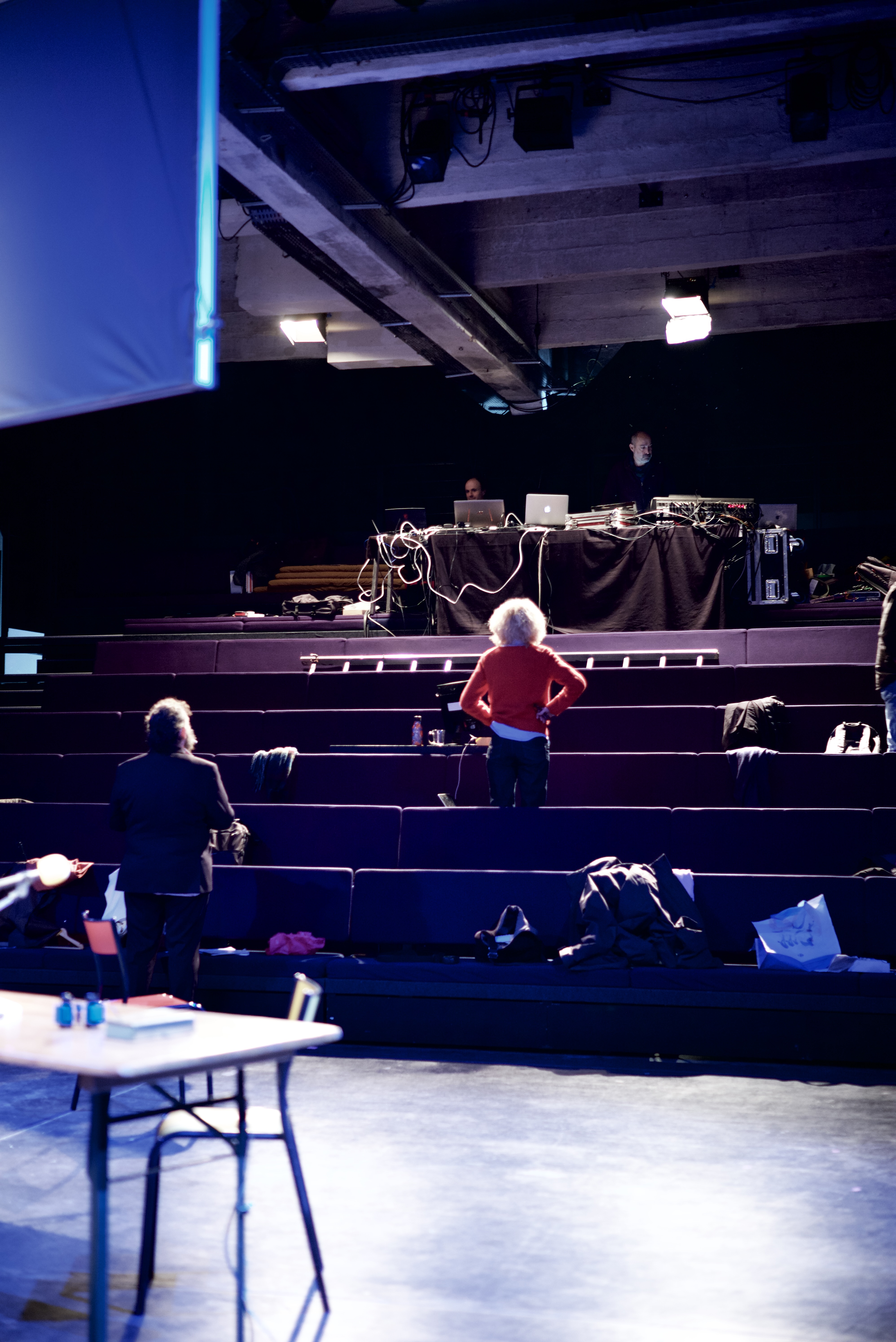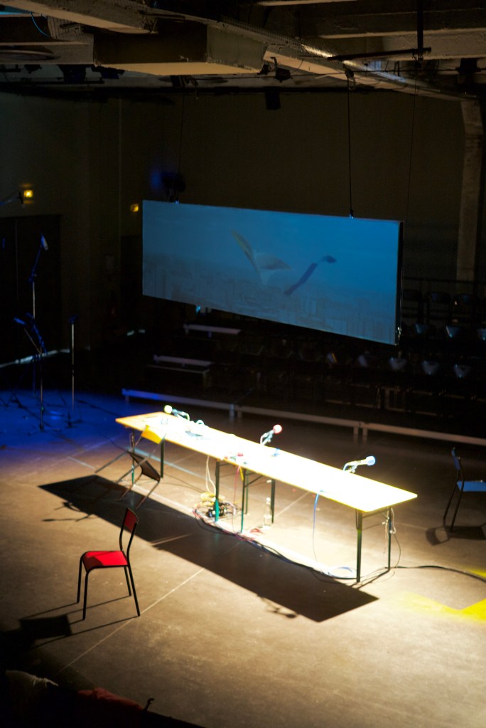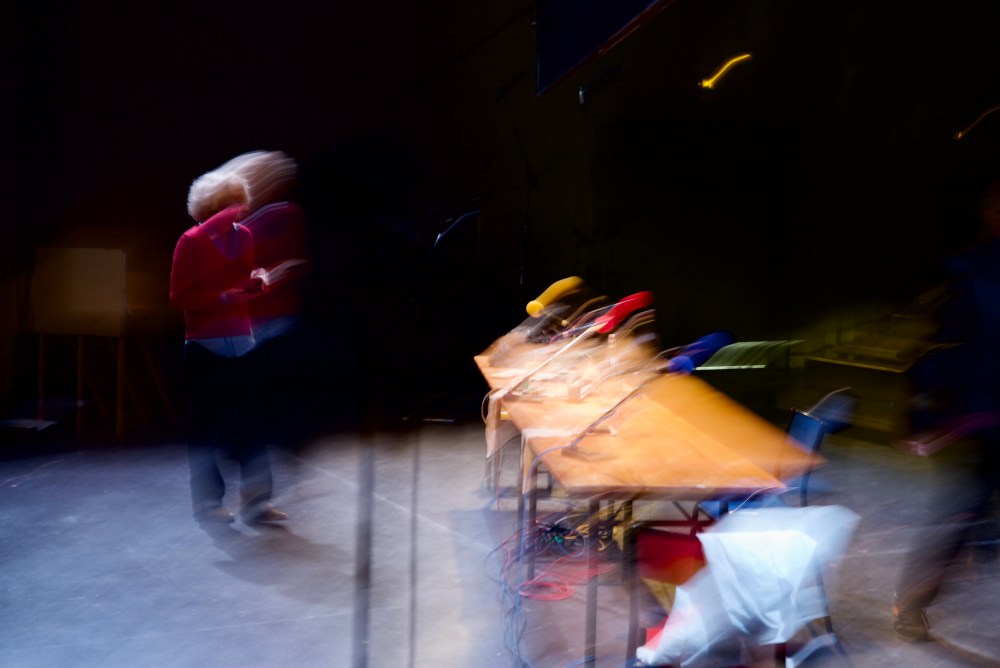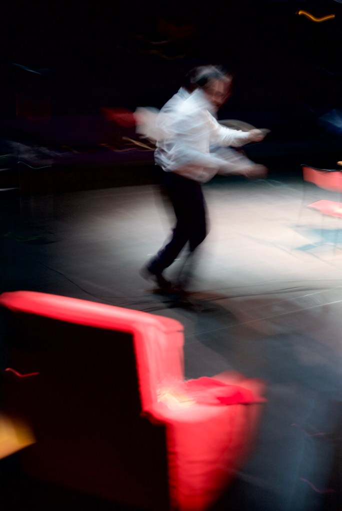 Ca filme, tandis que je photographie. Le temps de chaque geste photographique, chaque image (cela, le temps de chaque image, la durée de temps saisie, le flou, les linéaments, est à décrire aussi . Quart de seconde plutôt que centièmes, par choix), se soustrait à la durée du temps filmé. Je ne découvrirai cette video que le lendemain, en travaillant sur les images. (me ramène à ma candeur, à cette discussion sur le pavé de la cour de l’Echangeur, avec Camille Perrin-Springaux, sur l’image mouvante, sur le beau travail de Morgane Ahrach, sur la nécessité, le désir d’inventer. Tout ce qui – précisément- advient ici au plateau. Vivant spectacle)