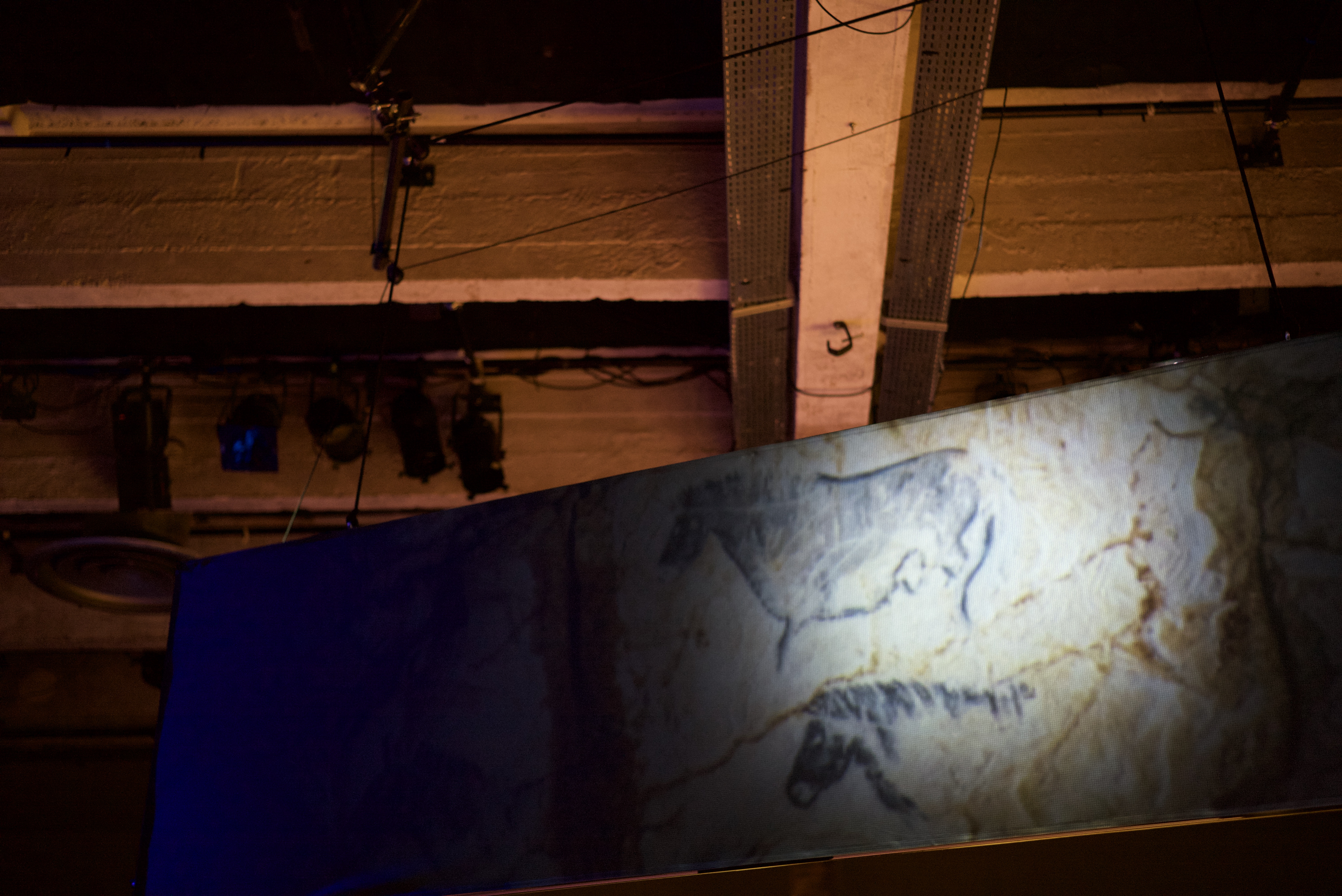 Dans la cour, Christian évoque le long travail d’adaptation au lieu. Ses lumières, ses projections ont besoin de rencontrer un « corps », un substrat. La meulière et la brique des Nonnains, le béton ici. Lumières furtives et cosmiques à la fois. Pariétales.