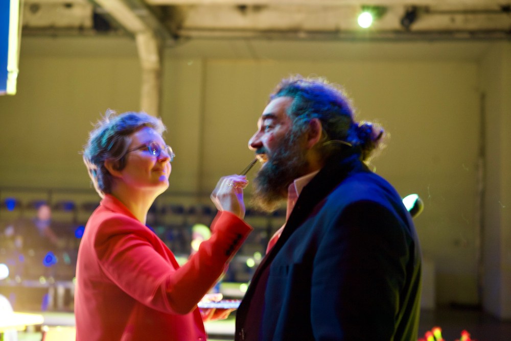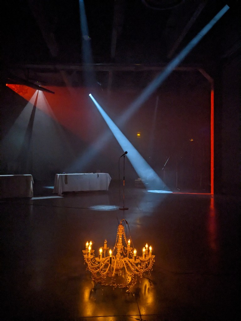 Je ne le remarque pas de suite, mais ça filme, tandis que je continue à me déplacer, à « rôder le lieu », cet autre « corps du roi » mis en résonance par les lumières de Christian, par l’espace audible créé par Michael, par la vie insufflée de toutes et tous. Le fleuve « Sauve qui peut… » se déverse, se déploie et rebondit.